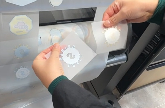 ③フィルム印刷後、シェーカーでパウダーを塗布しベイキングを行います