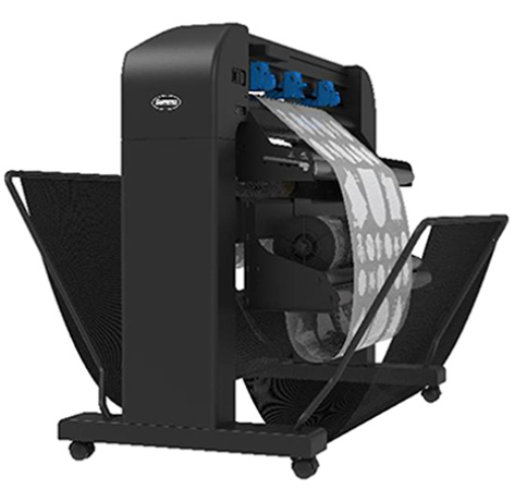 自動でロール巻き取り機能が搭載されており、インク面を外側にしてロールを巻き取ることで、長尺のフィルムの巻き取りが可能となります。フラットベッドのプロッタではフィルムを完全に切り離してしまいますが、当DTFプロッタではミシン目カットでカット済みフィルムをロール状に扱えるので、手間がかかりません。