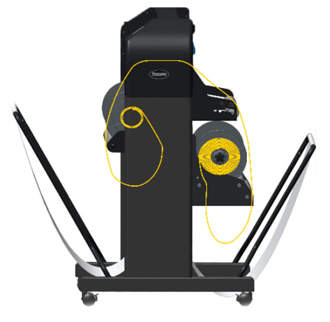 ④シェーカーで巻き取ったフィルムの両サイドにメディアホルダーを付け、プロッタ背面にフィルムを置いてセットします